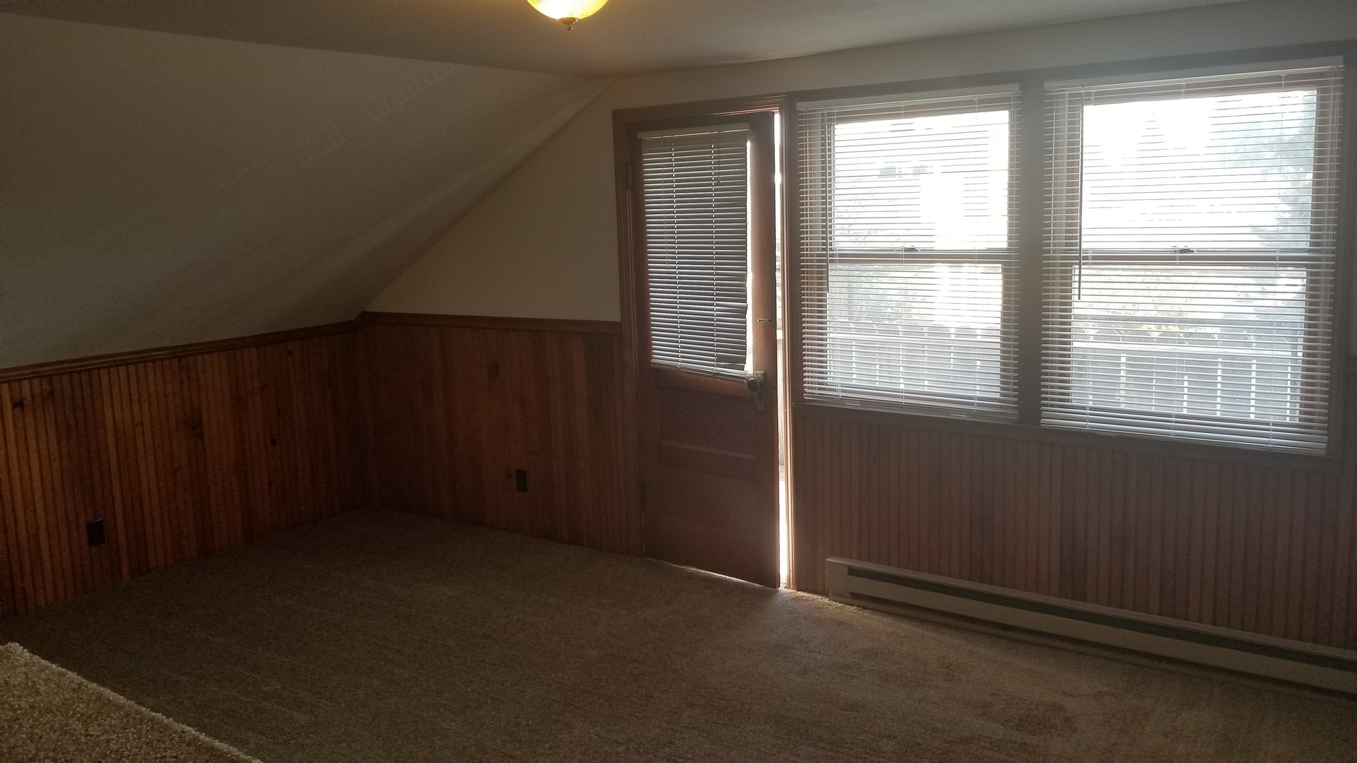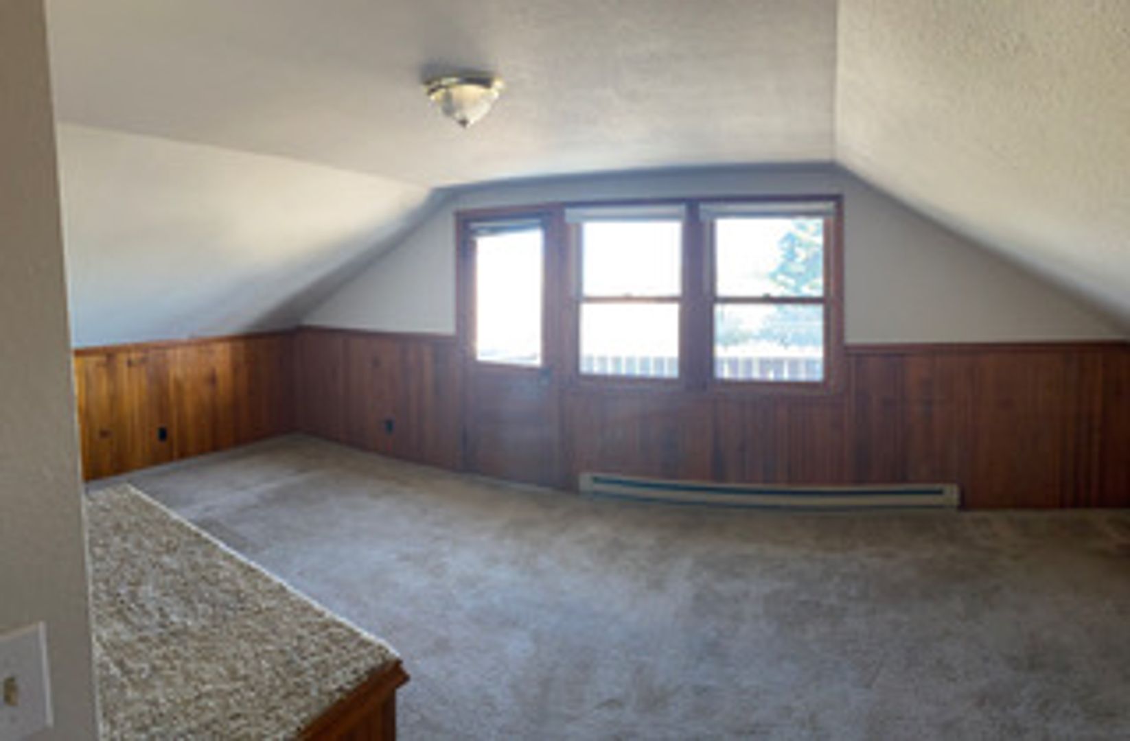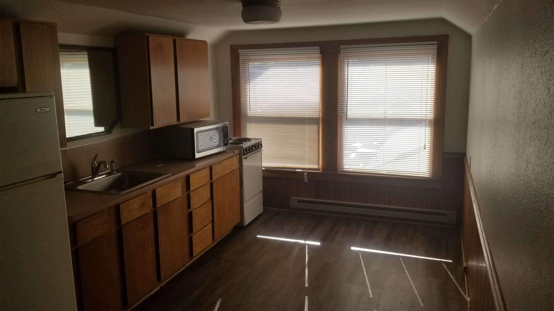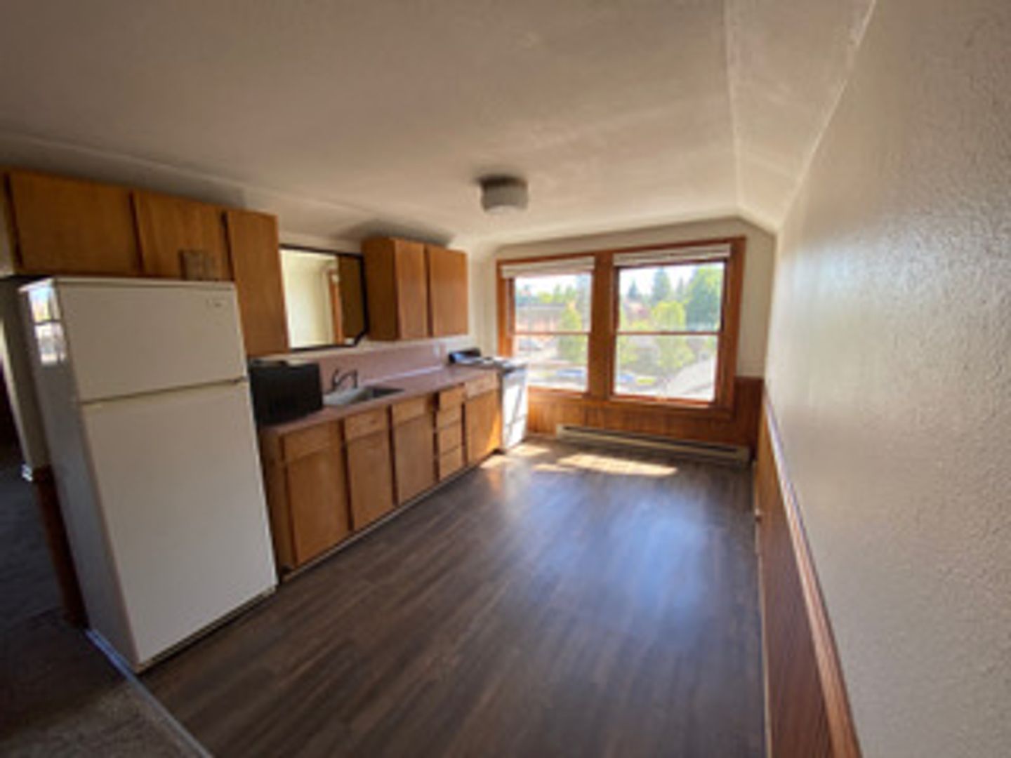 This is a light and cheerful apartment with vaulted ceilings in the living area. Spacious kitchen with fridge, range, microwave, and plenty of room for kitchen table. The bathroom has a shower stall - no tub. You will be on the 3rd level of the building, and have your own balcony to view the stars. This apartment has a security system on front door. Co-op laundry facility located next door at 734 NW Broadway. Free Parking permits available from the city of Bend. Heat and Electricity are included in one low utility co-pay!